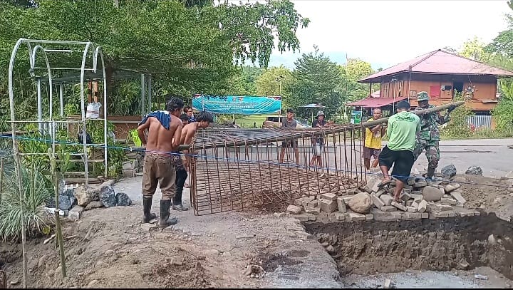 Babinsa dari Koramil 1310-06/Airmadidi terjun langsung bersama warga dan pekerja untuk mempercepat pembangunan Jembatan Perintis Garuda.